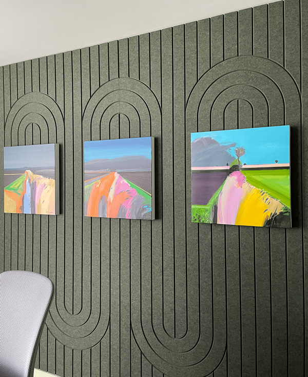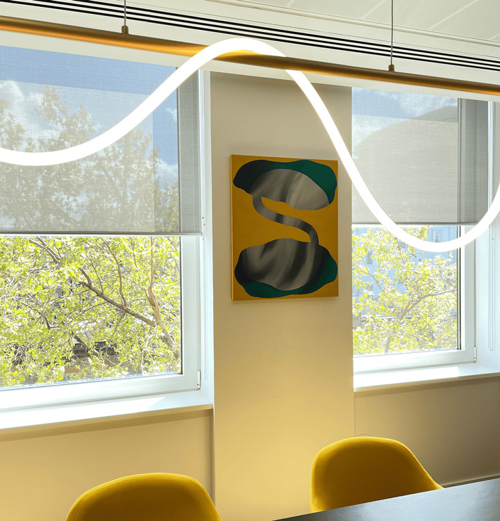 We presented a collection of artwork designed around the client’s interest. Special attention was paid to the companies “listening rooms”, a series of client-facing interview rooms where artwork was placed strategically to provide a diverse background in corporate calls.